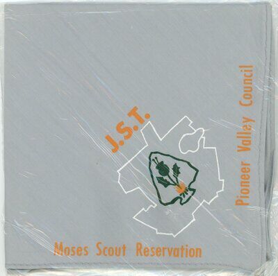 Gray neckerchief with orange JST and orange Camp and Council name, camp outline and logo