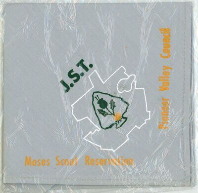Gray neckerchief with green JST and orange Camp and Council name, camp outline and logo