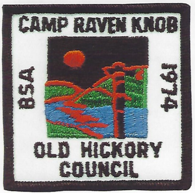 Square, black rolled edge, night scene of lake and totem pole on white twill, dated.
