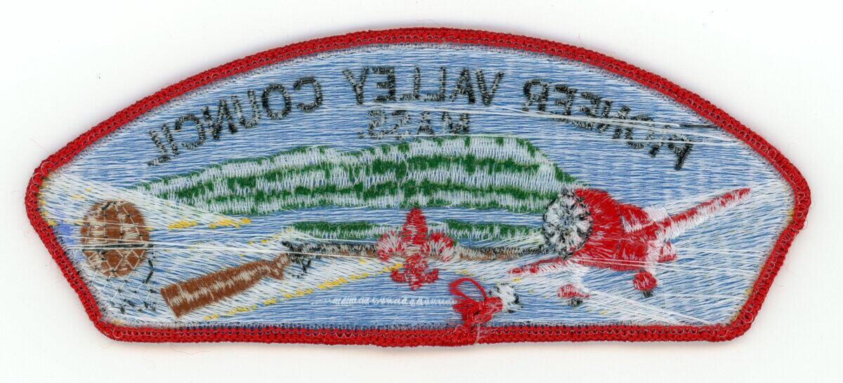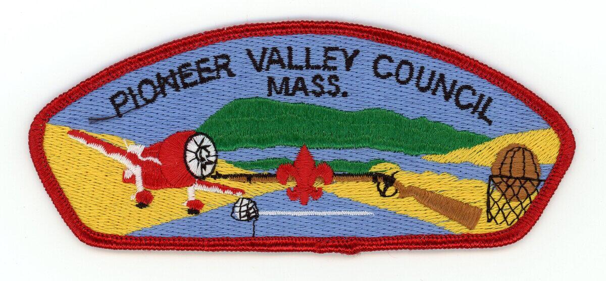 The Plane is a Gee Bee Racing plane, the Rifle is a Springfield Rifle, the sword and the rifle were both made at the Springfield Armory, the site for which was chosen by George Washington. The Basketball and hoop represent the fact that Basketball was invented in Springfield, MA, which is the largest city within the Council Area.