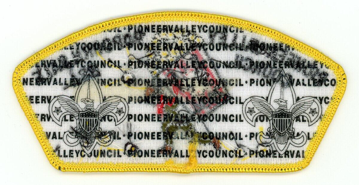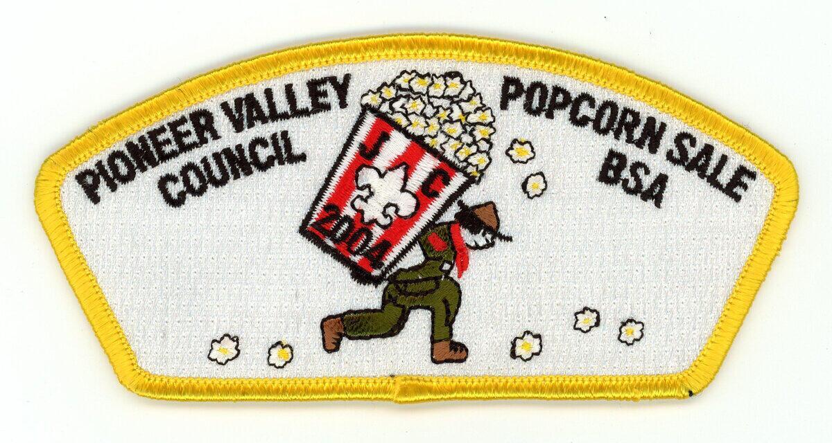 2004 Popcorn Sales issue. The JC on the box are the initials of the youth that designed the patch. Plastic back with Scout emblems and Pioneer Valley Council
