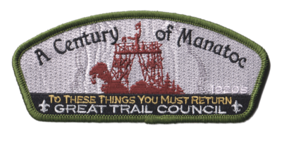 The design is of the original Camp Manatoc gateway from 1923. In order to fund the Manatoc 100 celebration, a series of 10 CSPs was produced. One CSP was produced approximately every three months, and each commemorated one of the 10 decades of Camp Manatoc.