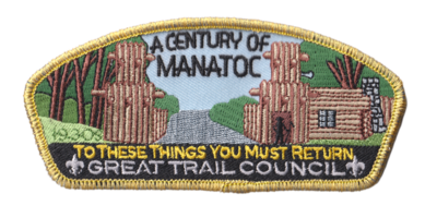 Design is of the "new" Camp Manatoc gateway when camp opened in 1932. In order to fund the Manatoc 100 celebration, a series of 10 CSPs was produced. One CSP was produced approximately every three months, and each commemorated one of the 10 decades of Camp Manatoc. GMY border CSPs were presented by the event chairman, at the conclusion of the event, to staff members who performed exceptional service to the event.