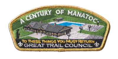 The new swimming pool and shower house facility is featured in this design. In order to fund the Manatoc 100 celebration, a series of 10 CSPs was produced. One CSP was produced approximately every three months, and each commemorated one of the 10 decades of Camp Manatoc. GMY border CSPs were presented by the event chairman, at the conclusion of the event, to staff members who performed exceptional service to the event.