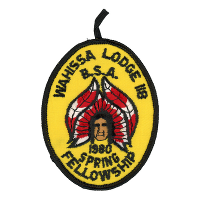 1980 SPRING FELLOWSHIP; Native American with RED, WHT, BLK bonnet