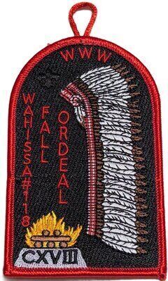2025 Fall Ordeal, Third of the Bonnet Series, Side Profile of a Brown/White Bonnet over OA Fire, FDL above the word FALL, WWW at top, and CXVIII (118) supporting the fire.