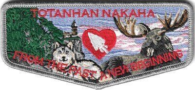 Pocket flap issued to celebrate two districts from Ka'Niss Ma'Ingan Lodge 196 (Voyageurs Area Council) joining Totanhan Nakaha Lodge 16 and Northern Star Council. Totems from both lodges are included in the patch design