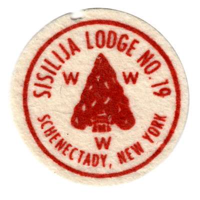 Silk screened felt; 27x32mm arrowhead; arrowhead points to "O" in Lodge;