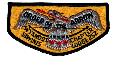 Horizontally Stitched Background; Vertically Stitched Eagle; "Order of the Arrow"; Black Lockstitched Border; Yellow/Orange Background
