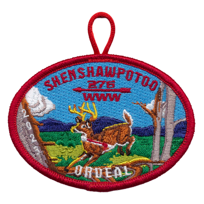 2023 Spring Ordeal. Horizontal oval, based off old J style deer jumping over tree. "2023" in bark of tree, "ORDEAL" in WHT across bottom