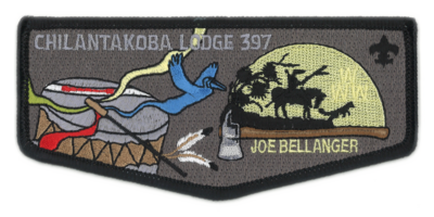 Issued in Rememberance of Associate Lodge Adviser Joe Bellanger. Joe was very involved in the Chilantakoba Lodge ceremonies teams and American Indian Activities. He was a singer on the Yellow Moon Native American Drum and their symbol is represented on the flap. Other symbolism includes a fireman's axe as Mr. Joe was a Fireman, and a small leaping fox representing his Wood Badge critter.