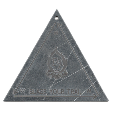 Vigil rededication totem, metal triangle with E9 logo in center, W's in corners, and "BLAZE YOUR TRAIL" at bottom