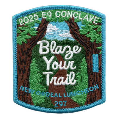 2025 Conclave New Ordeal Luncheon patch, wooded scene with a trail in the center, participant lodge numbers ghosted at bottom, host lodge "297" in white in bottom center. "WWW" on tree, "Blaze Your Trail" theme lettered in center.